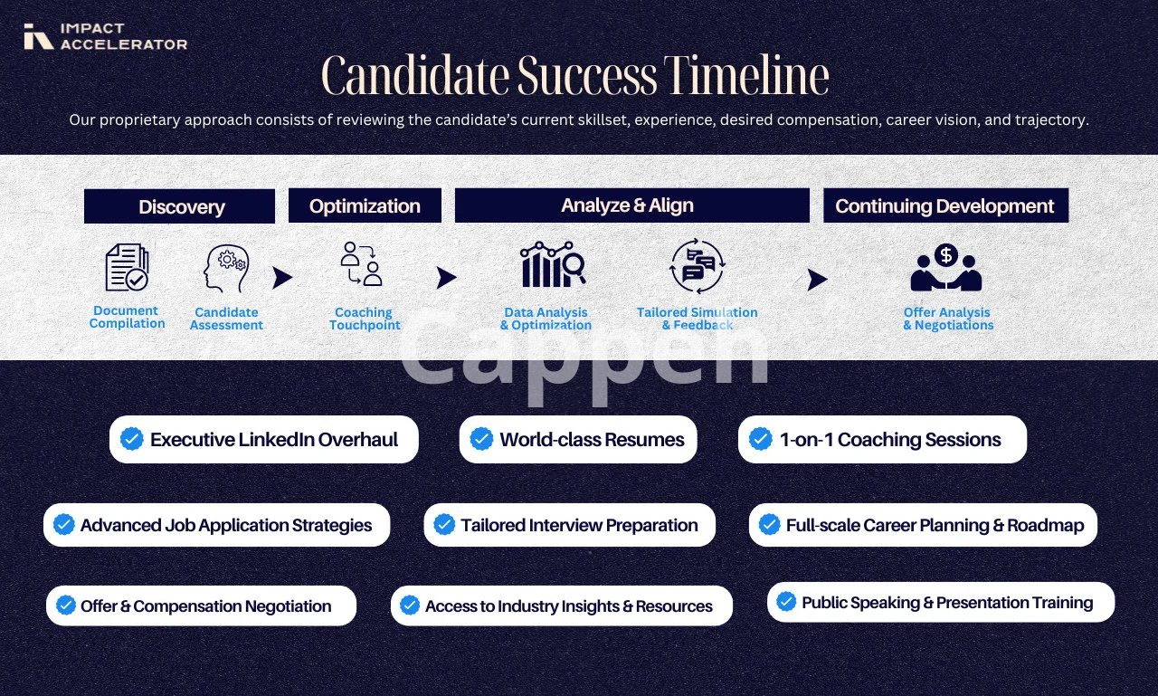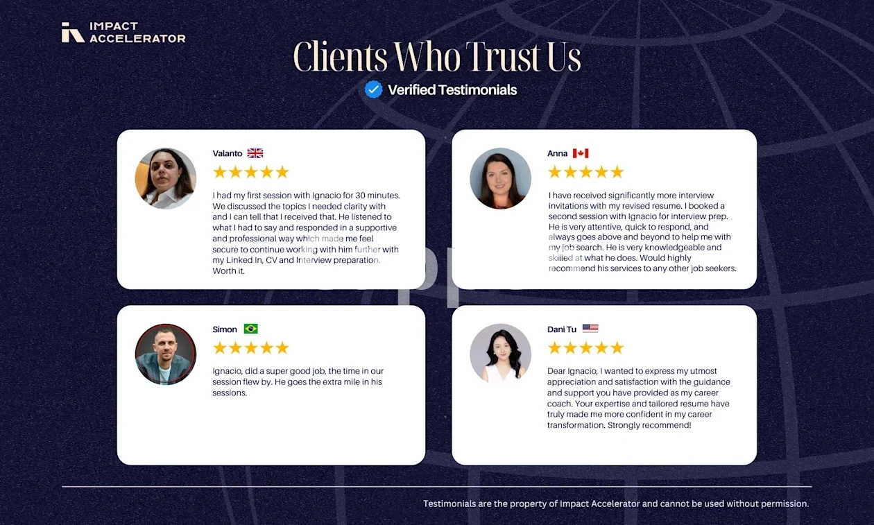 Industry-Leading Experience: Our background in leadership and recruitment at Fortune 500 companies and Big 4 Firms equips us with the knowledge to help you stand out. Documented Success: Our clients have seen up to a 2.5x increase in salaries, achieved promotions, and successfully navigated career changes. Check out our testimonials! Customized Coaching: Each session is tailored to your specific ambitions, ensuring you walk away with a clear strategy and actionable steps.