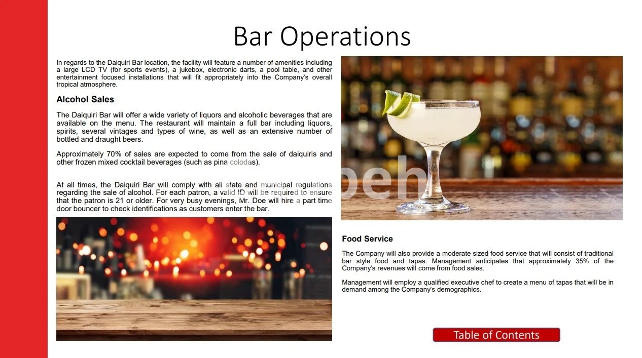 Since 2005, our firm has specialized in crafting tailored business plans for bars, restaurants, cafes, bakeries, and various other food and beverage enterprises.